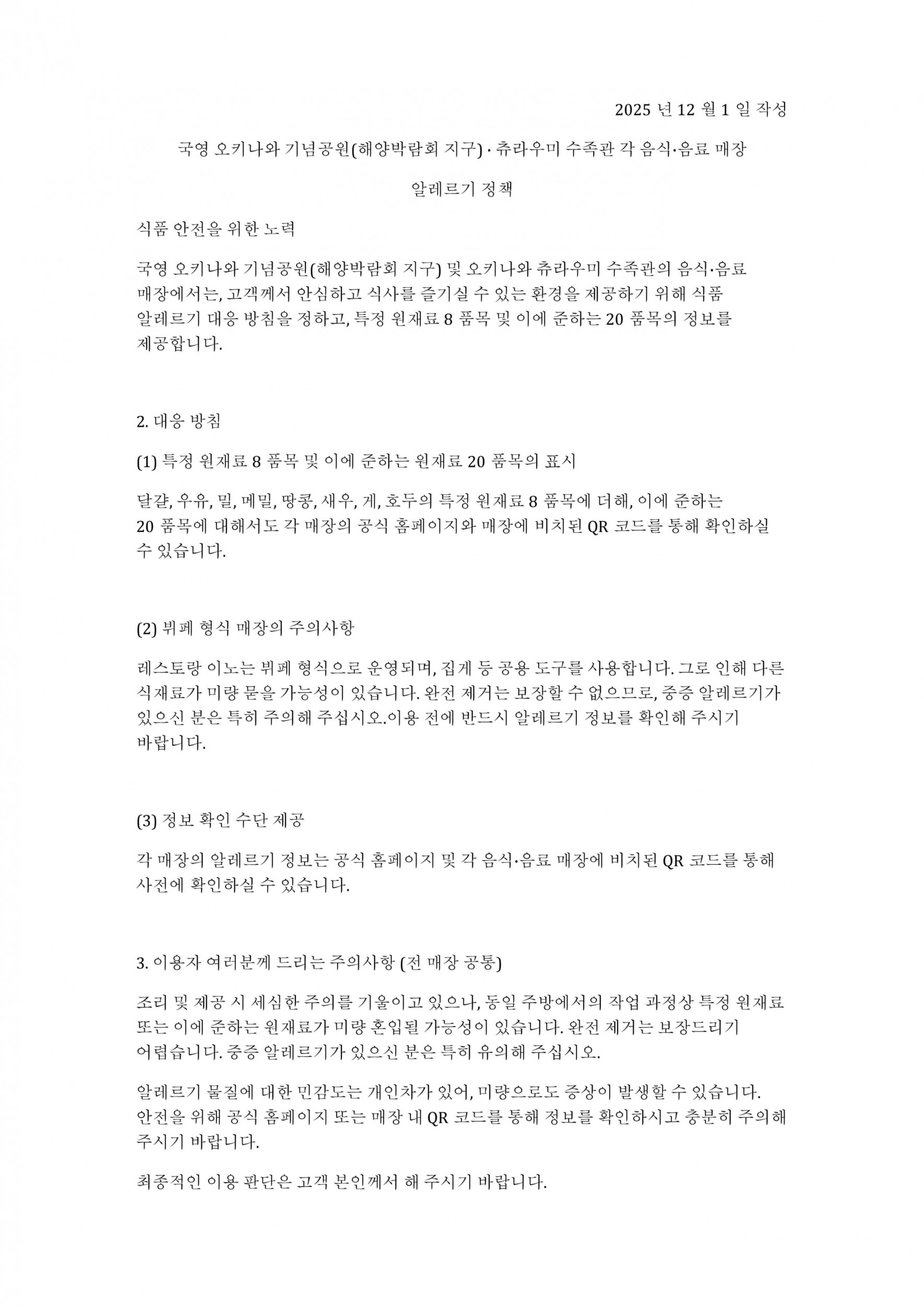 국영 오키나와 기념공원(해양박람회 지구) · 츄라우미 수족관 각 음식·음료 매장 알레르기 정책