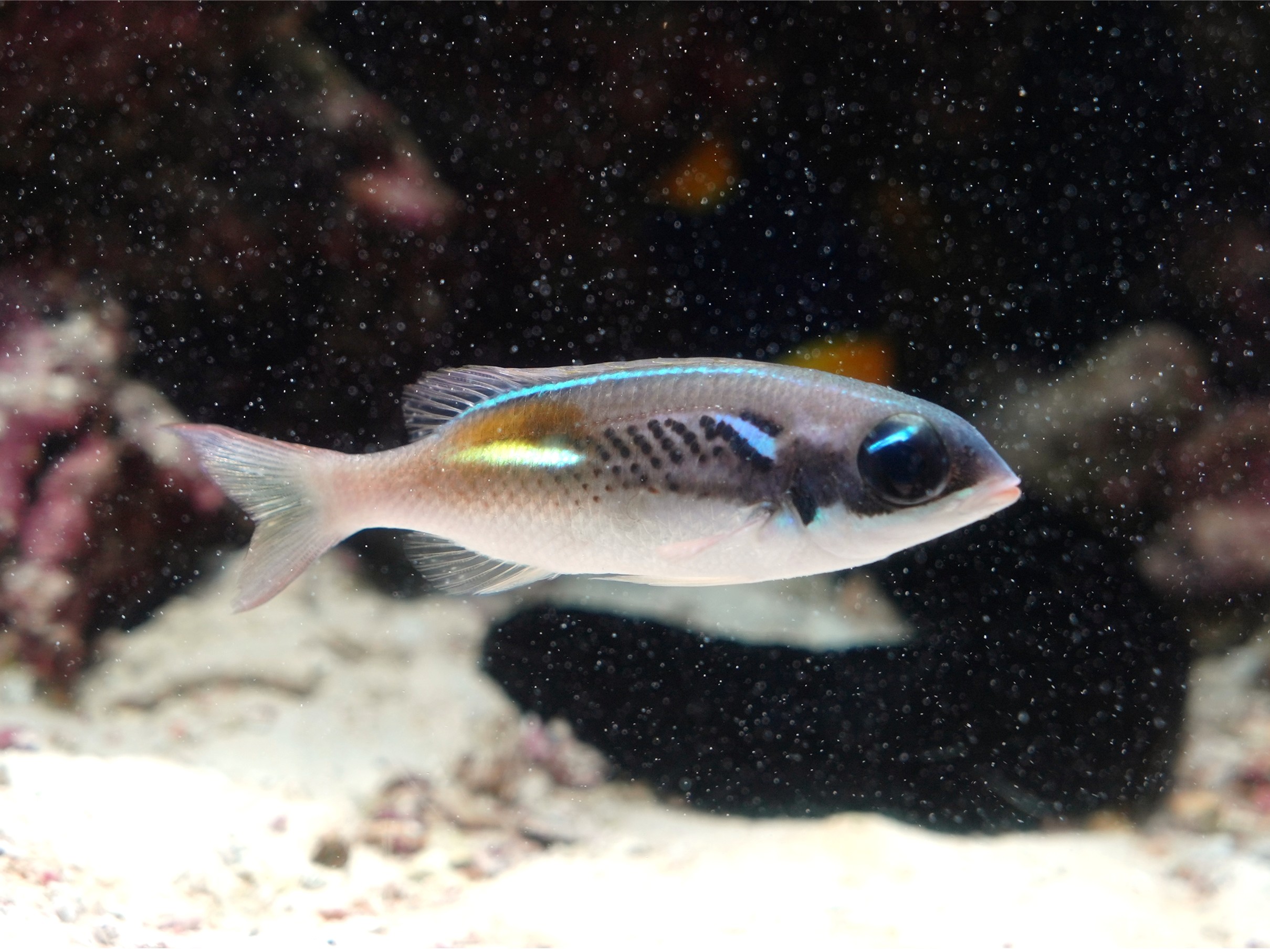 サンゴ礁に生息するイトヨリダイ科の1種で、全長は20㎝程度。水深5~50mまでのサンゴ礁域に生息する。体側背部前半は暗紫色、後半は淡黄色をしており、この色が仮面をかぶったように見えることが和名の由来となっている。
