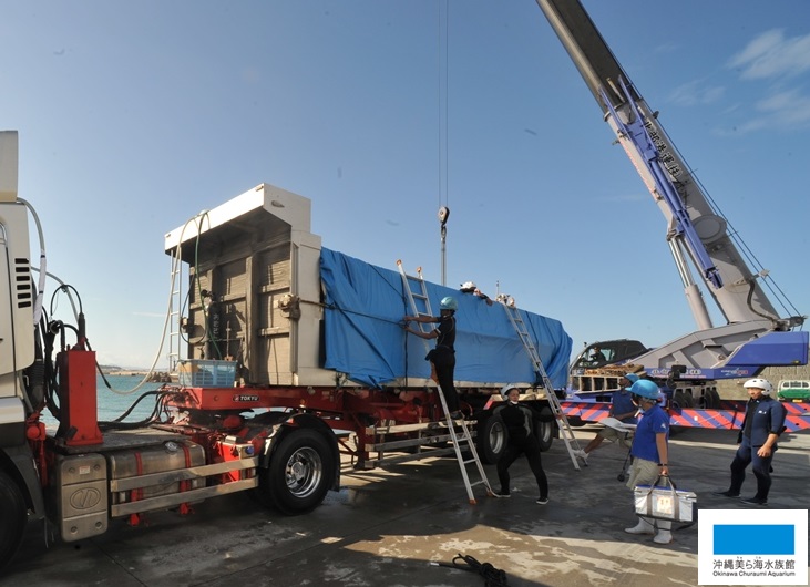 まず、ジンベエザメを船で生簀から水族館近くの港まで海上輸送します。そして、港から水族館へは大型トレーラーを使い陸上輸送です。トレーラーの荷台に専用のシートを張り、海水を入れて簡単な水槽の様にしています。ここへ移動させるのですが…