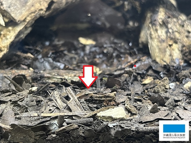 今回は、そのような彼らの生息環境を見ていただきたく、展示水槽は生息地を模して作りました。あまりにも良くできたためか?とても上手に隠れております。