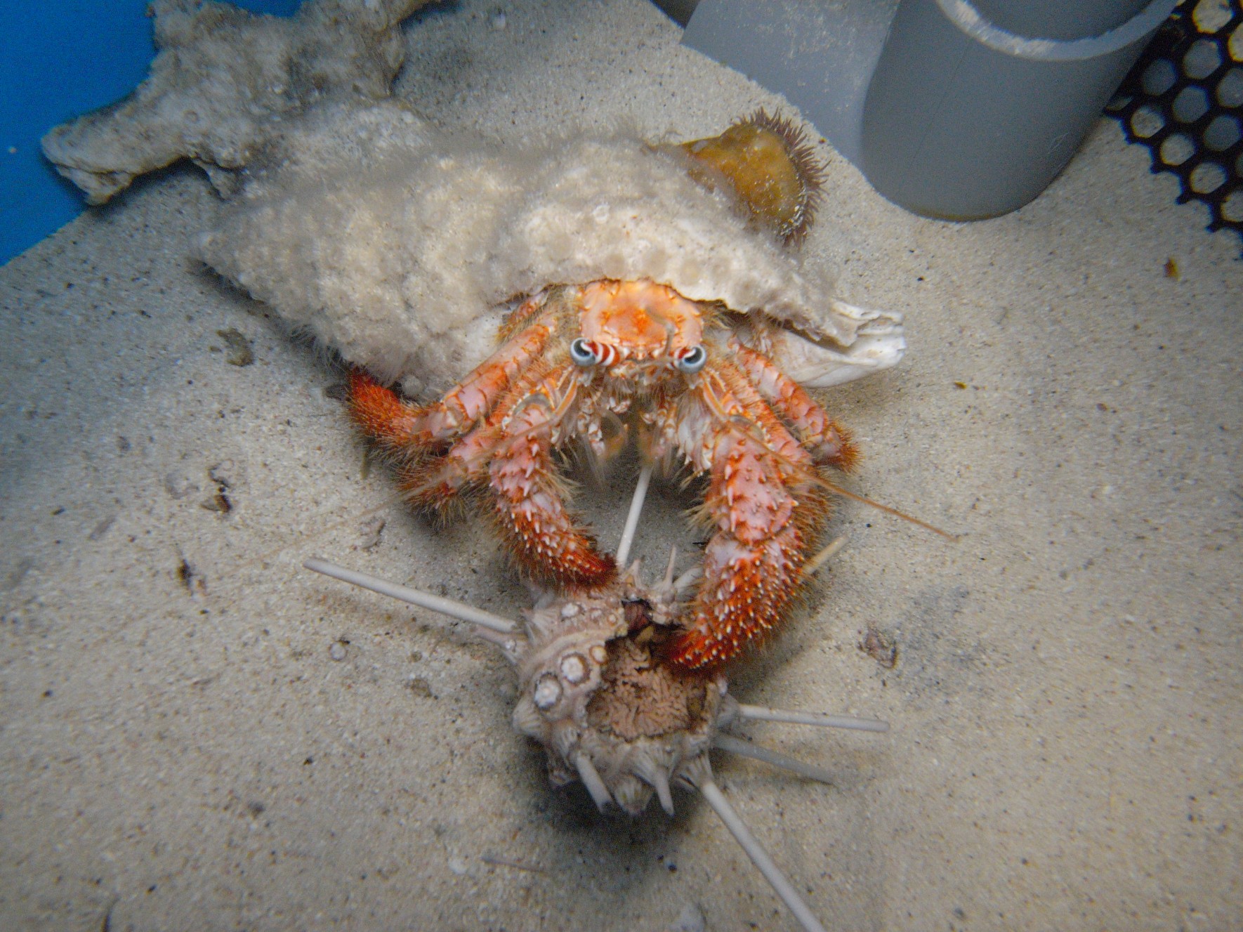 ヤドカリの中では大型になる種類。貝殻にイソギンチャクを付着させ、外敵から身を守る。悪食で、何でも良く食べる。