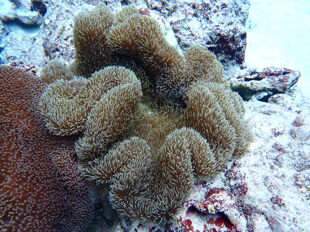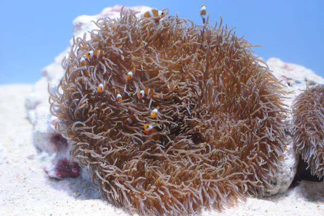 直径50㎝に達する大型のイソギンチャク。同属のイボハタゴイソギンチャクに比べ、やや長い触手が口盤を覆い、口盤の周縁は大きく波打つ。サンゴ礁の浅瀬で普通に観察できる。カクレクマノミやクマノミなどが共生する。2020年に当館が世界で初めて繁殖・育成に成功した。(写真3枚目は繁殖個体)