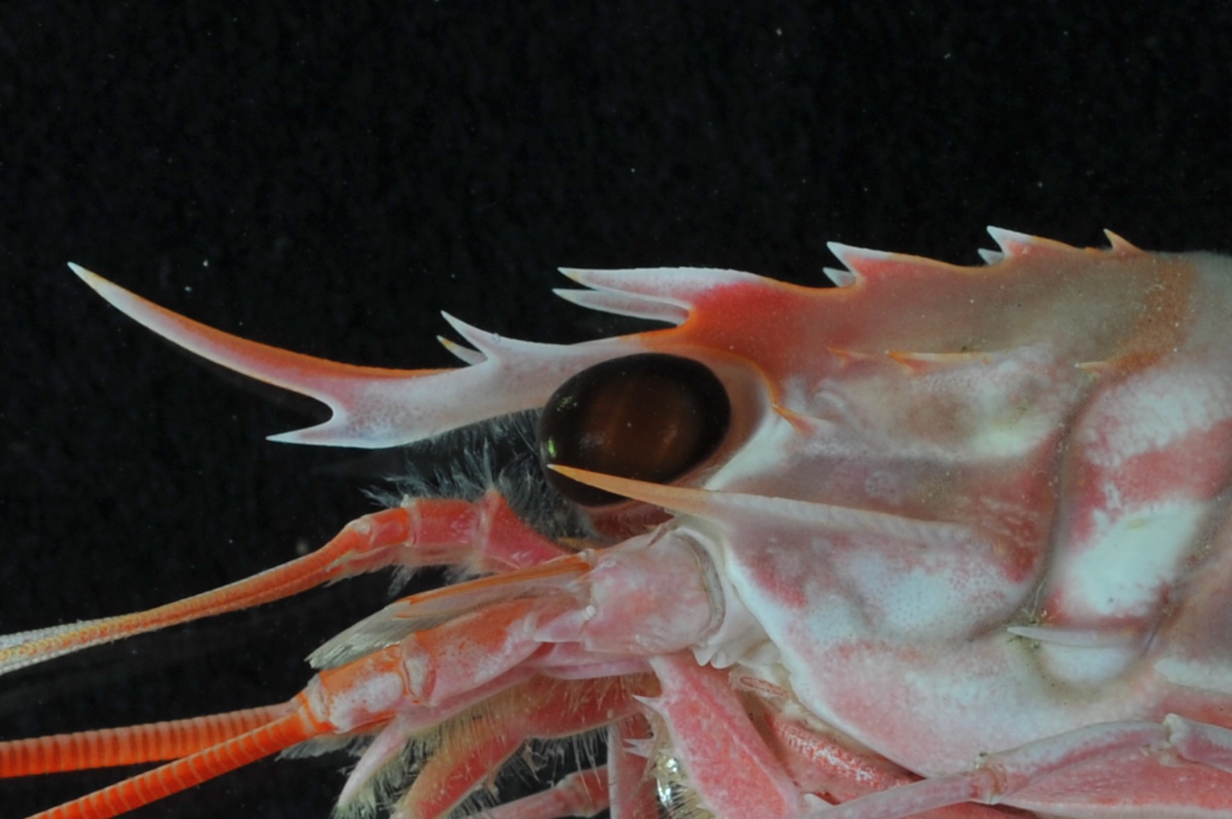 沖縄本島周辺では、水深650mより採集の記録がある。体の大部分が軟毛に覆われており、眼は小さく退化している。同じ水深帯に生息するサガミアカザエビと比較すると、眼の大きさの違いがよく分かる(2枚目のサガミアカザエビ頭部拡大画像を参照)。立派なハサミ脚を持つが、飼育下ではこれを使う様子は観察できない。餌を捕える時には、小さなハサミ状をした2番目と3番目の脚を用いるようだ。モザンビーク、マダガスカル、アラビア海、アンダマン海、フィリピン、日本の相模湾以南など、水深170-1000mより採集の記録がある。