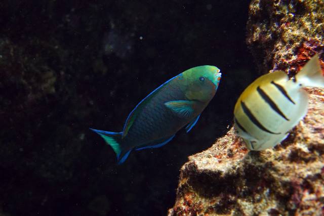 サンゴ礁域で見られる、やや小型のブダイの仲間。体型は特徴的で、頭部が丸みを帯びる。画像の個体はオスで、頭部の鮮やかな黄色や緑色の色彩が特徴。