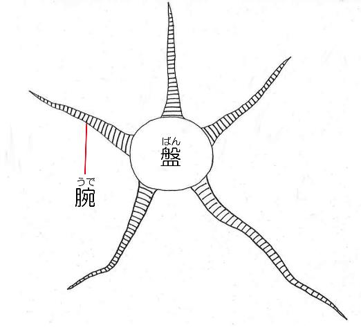 ヒトデとはまた別の生き物で、クモヒトデという棘皮(きょくひ)動物の仲間。盤と腕の区別がはっきりとしていることで、ヒトデと区別することができる。普段は、腕の一部だけを出して砂の中にもぐり隠れており、餌の匂いがすると砂の中から出現し、柔軟な腕を巧みに振り動かし、餌のもとへと海底をはって移動する。本種は、クモヒトデ類の中では比較的腕が短いタイプである。