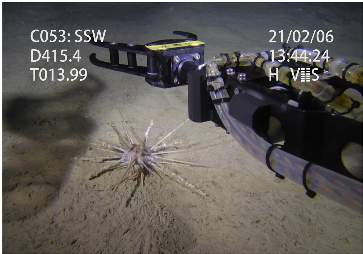 水深415mの泥底を調査中に、サテライトウニ属の一種の棘にしがみついているところを発見し、ウニごと捕獲した。