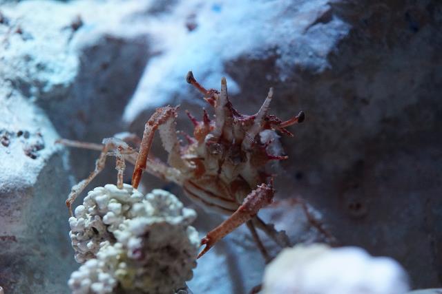 甲幅4cmほどの小さなカニの仲間。和名にあるように長く伸びた2本のツノ(額角)が特徴。体表にカイメンや海藻などを付けて上手に身を隠すことができる。