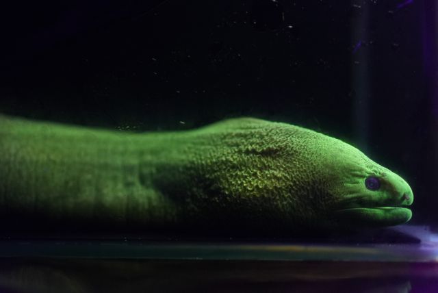 黄色い体に白い模様がはいる、深場に生息するウツボの仲間。2023年1月に沖縄本島沖の水深300~400mからカゴを用いて採集した。成長すると約70㎝になる。水槽内では、岩陰などに隠れていることが多く、ほとんど姿を見せない。紫外線照明で蛍光に光る。