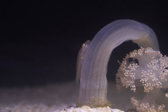 当館所有のROV(無人潜水艦)で採集された個体をもとに、2025年に日本初記録種として報告された。写真の個体は、沖縄本島沖の水深約100mで「トゲトサカ属の一種」と共生する様子が観察されている。成熟しても2-3㎝と小型で、透き通った体を利用してサンゴなどに擬態して姿を隠す。宿主依存性の体色変化をする可能性があると考えられている。和名の“クガニ”は沖縄の方言で「黄金」を意味し、本種の特徴的な体色に因む。