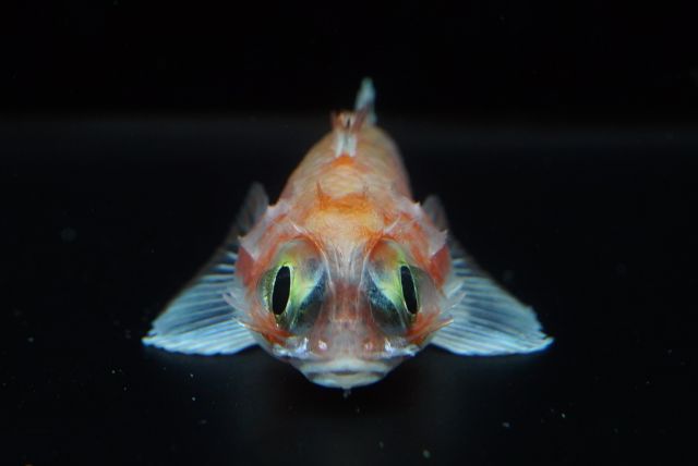 インド・太平洋に生息し、国内では静岡県、愛知県、和歌山県、三重県、高知県、東シナ海から記録されているヒメキチジ科ヒメキチジ属の一種。ヒメキチジ属は全長8㎝程度の小型魚類で、頭部に大小の棘を多くもち、体全体が赤いのが特徴。2021年に本属の分類学的再検討がなされ、8新種を含む10有効種が認められた。同年、日本産ヒメキチジ属3種の和名が整理され、新称ヨロイヒメキチジの標準和名が提唱された。和名は、本種の頭頂部にある特徴的な長い棘を“鎧(よろい)”にみたててつけられた。写真個体は2025年11月に実施された沖縄本島沖の深海調査で水深470mから採集された。