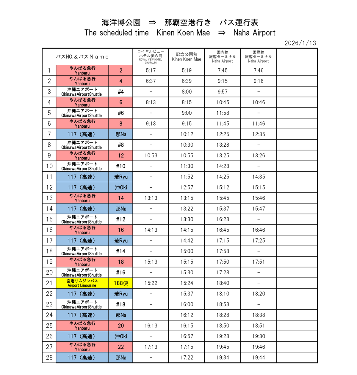 詳しくは、(社)沖縄バス協会ホームページ、やんばる急行バスホームページ、沖縄エアポートシャトル、カリー観光美ら海ライナーをご覧ください。