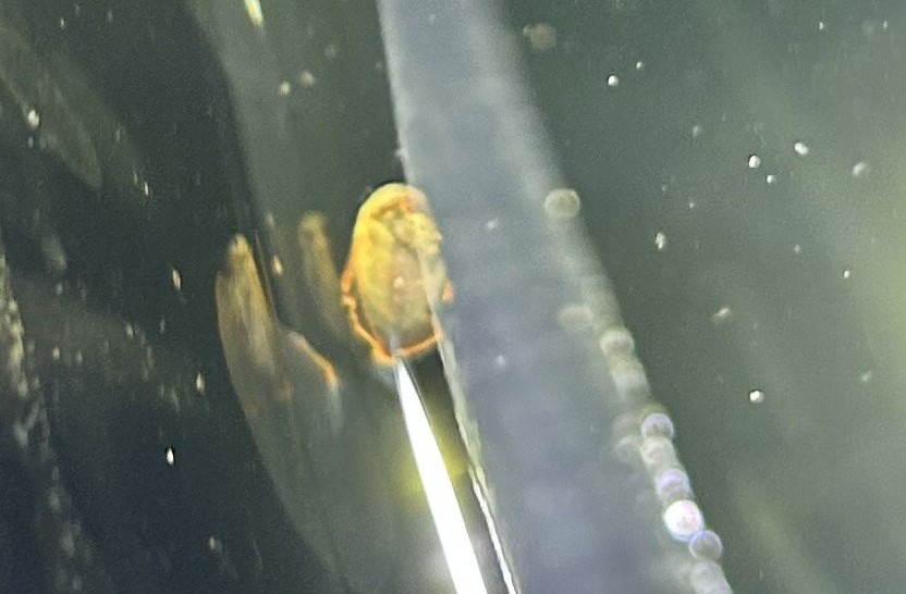 親魚は、2013年から2016年にかけて沖縄島北部より搬入した3個体です。2025年9月14日夕方頃から、雄2個体が雌1個体を盛んに追尾する行動が観察されました。その後、18日朝に直径約1.3 mmの受精卵を回収し、孵化槽に収容したところ同日夜に孵化しました。本種の受精卵(発眼卵)は、飼育槽の塩分(32 psu)で静置した場合、 一般的な海産魚類の卵のように水面には浮かず、水槽底部に沈むことが確認されました。仔魚は体の前半部が丸みを帯びた体形をしており、孵化後約2週間は水底付近を遊泳していましたが、その後、わずか2日ほどで体高が急激に増加し、稚魚期特有の枯れ葉のような姿に変化しました。これと同時に遊泳場所が水面付近へと移行する様子も観察されました。