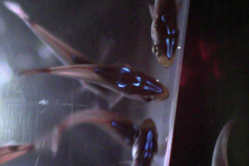 薄暗い環境で水槽の下から高感度カメラで撮影すると、腹側が青色に発光する様子が観察できます。この発光に使われる酵素や化学分子は、キンメモドキ自身は作ること(生合成)ができずに、エサであるウミホタルの一種(Cypridina noctiluca)から摂食により取り込んでいます。